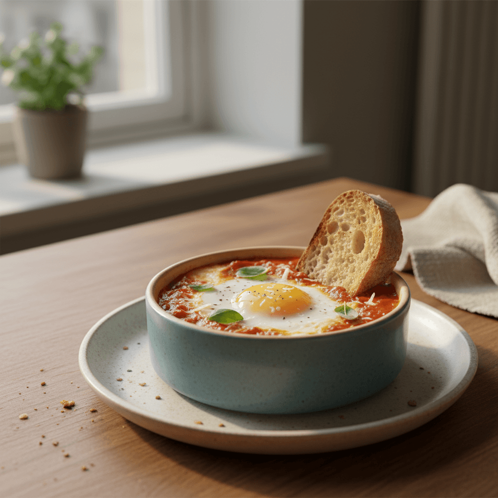 Huevos en cocotte con tomate y albahaca