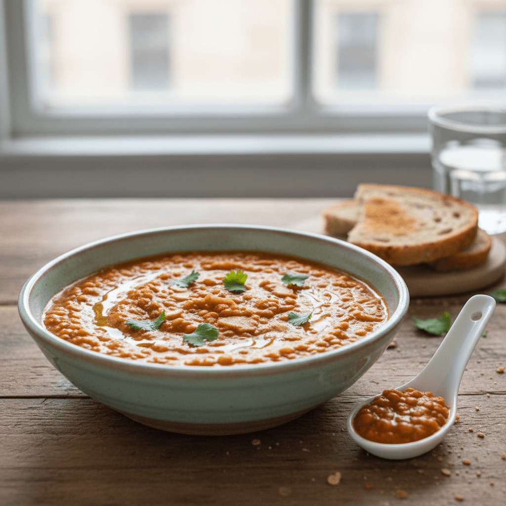 Las lentejas rojas se deshacen solas creando una textura cremosa perfecta para GLP-1. No necesitan remojo y se cocinan en 20 minutos. El jengibre ayuda con las náuseas.