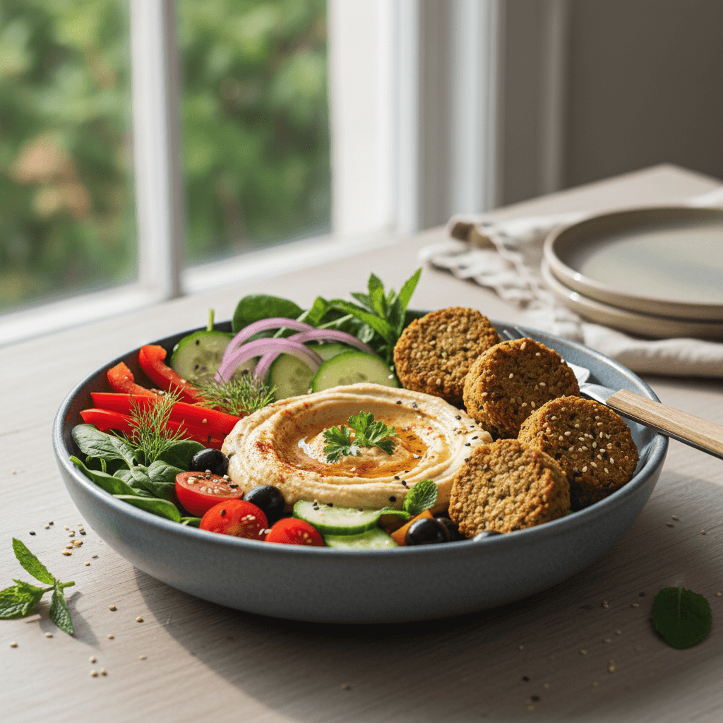 Plato completo y visual. Los falafel al horno son más ligeros que fritos, el hummus aporta cremosidad, y las verduras frescas dan textura. Ideal cuando quieres algo diferente y tienes mejor apetito.
