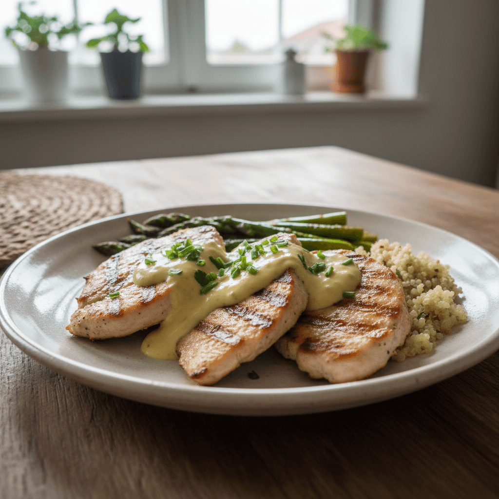 Proteína magra lista en 15 minutos. La salsa de mostaza y yogur aporta cremosidad sin pesadez. Perfecta para tener cocinada y comer en porciones pequeñas durante el día.