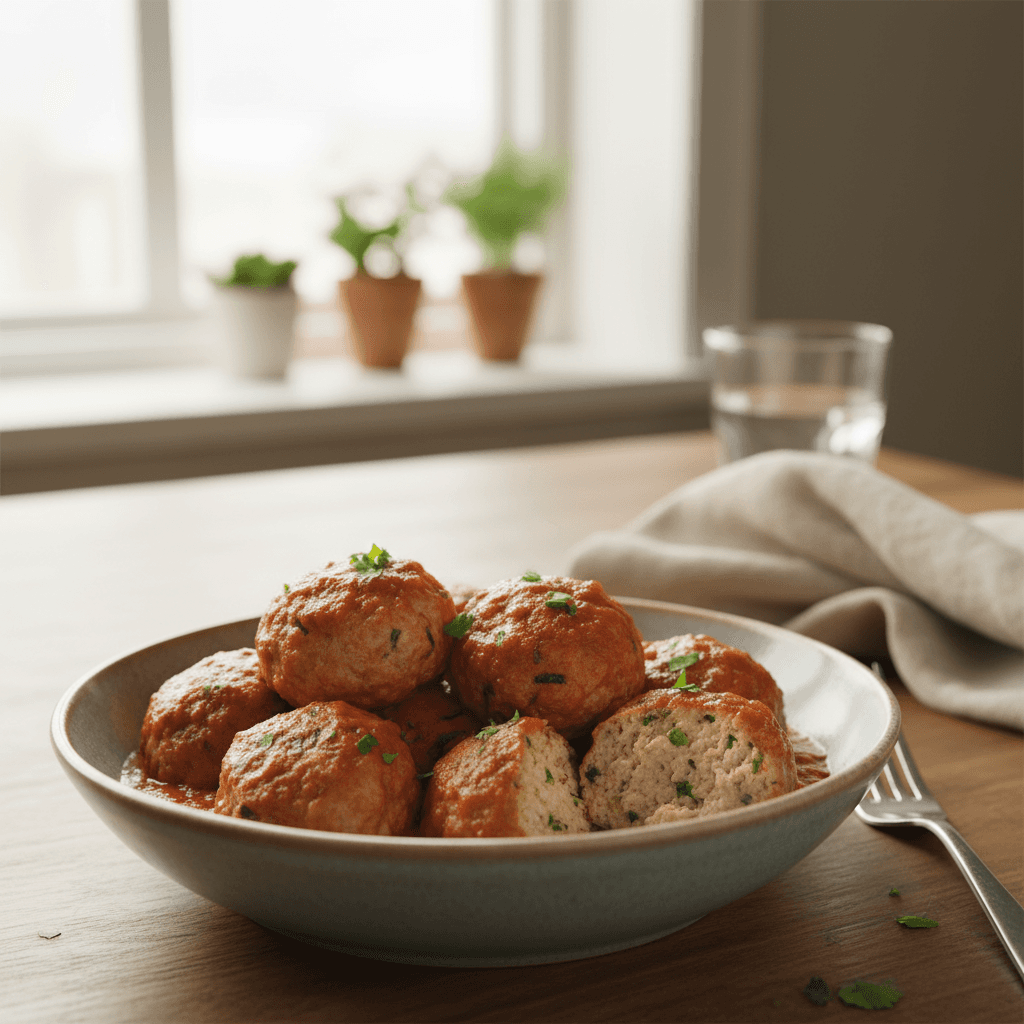 Albóndigas jugosas y ligeras. El calabacín rallado aporta humedad sin añadir grasa, perfecto para que la carne de pavo no quede seca. La salsa de tomate las hace más fáciles de tragar.