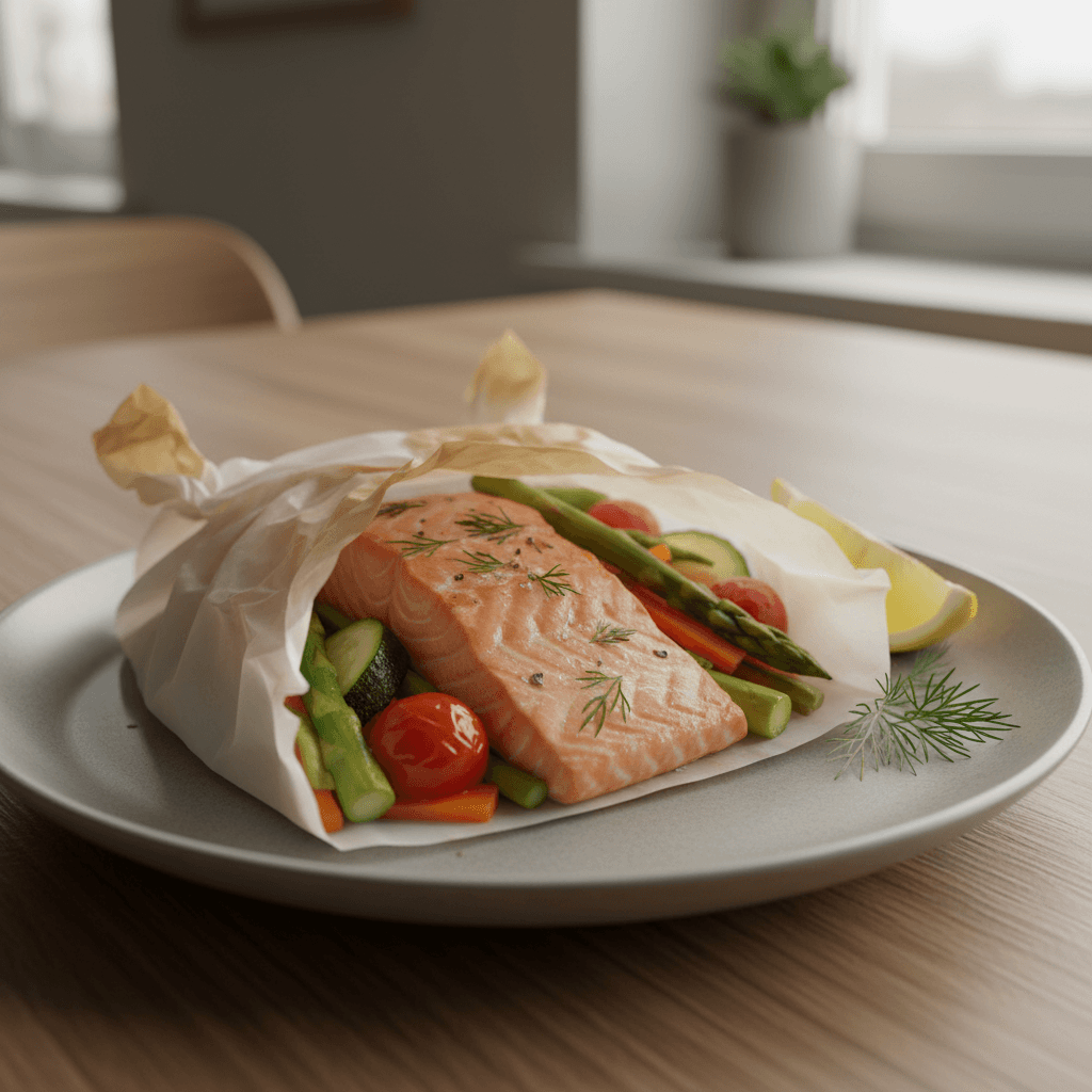 Servir: Llevar cada papillote cerrado al plato. Abrir en la mesa (cuidado con el vapor). Servir con el jugo que ha soltado.