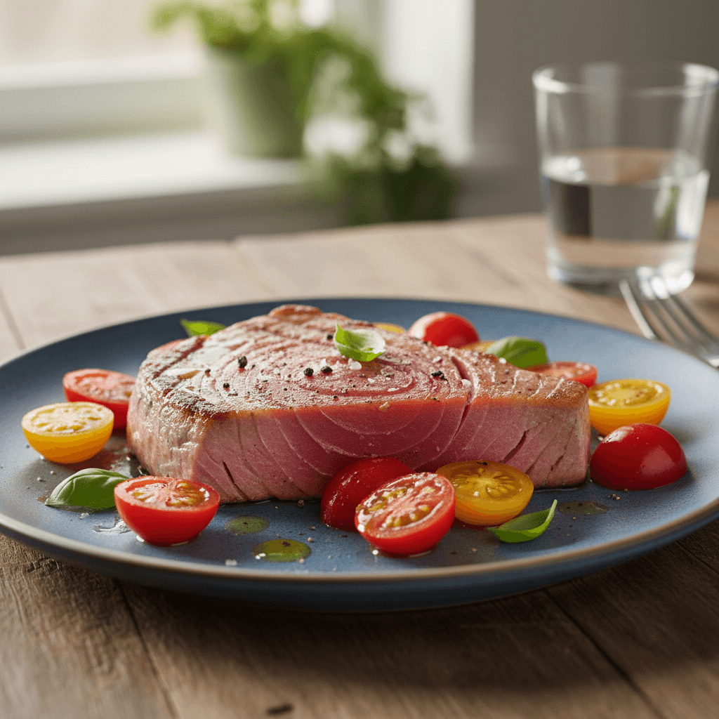 Atún rojo o bonito cocinado como un filete. Textura carnosa, se puede dejar poco hecho en el centro. Alto en proteína y Omega-3. Listo en 10 minutos.