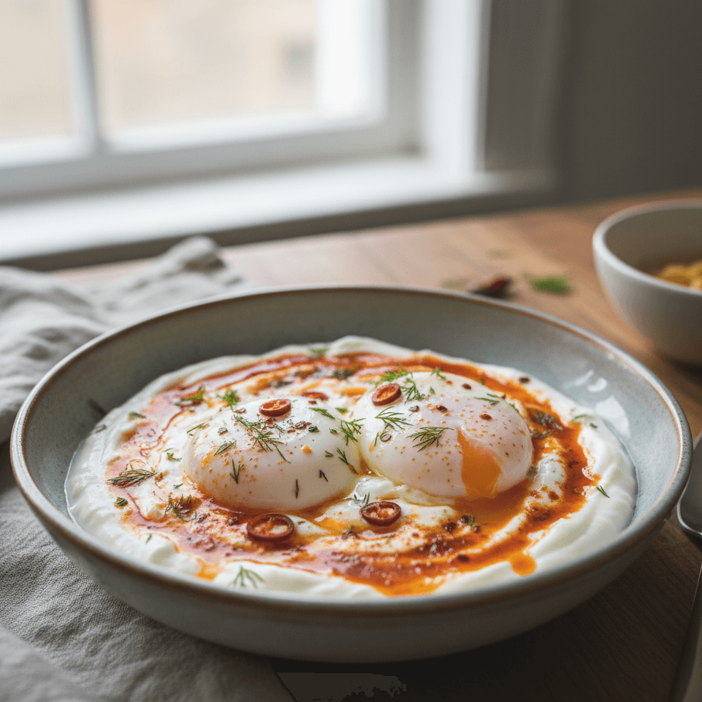 Huevos escalfados sobre yogur con mantequilla especiada. Combinación caliente-fría, cremosa y fácil de digerir. Receta mediterránea oriental adaptada a España.