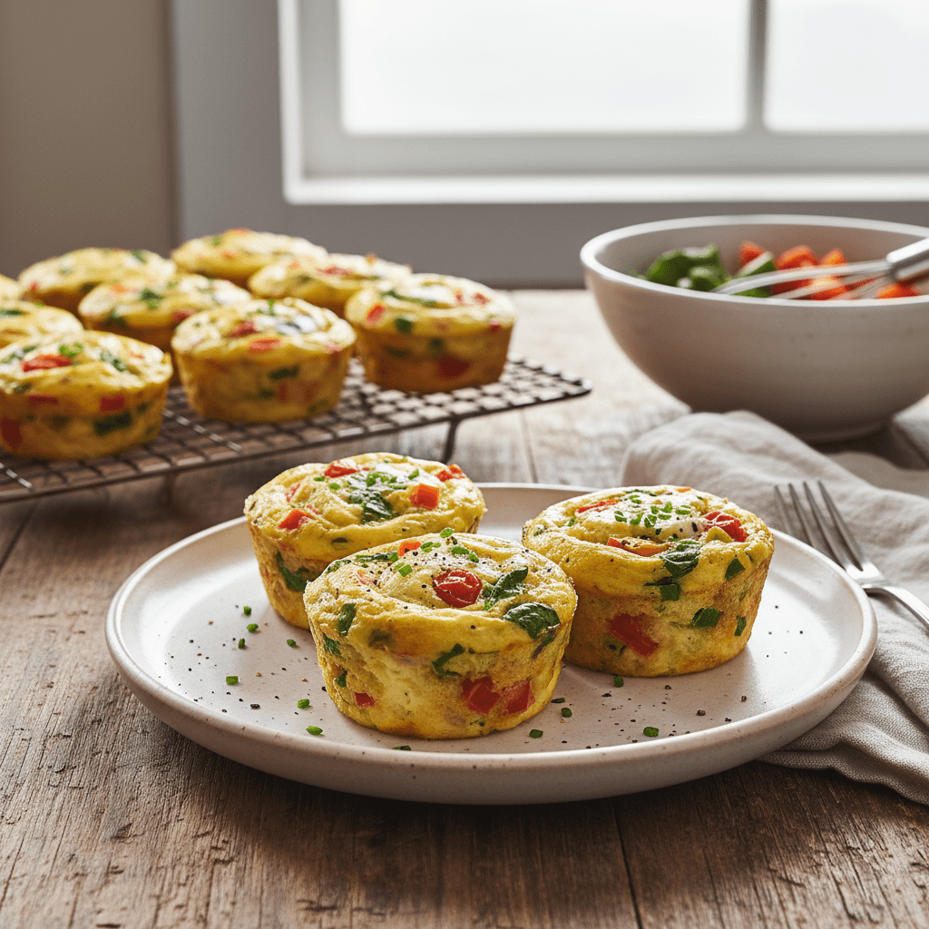 Porciones individuales de huevo con verduras horneadas en moldes de muffin. Perfectas para batch cooking: haces 12 unidades, comes 3 por ración, guardas el resto. Ideales frías o recalentadas.