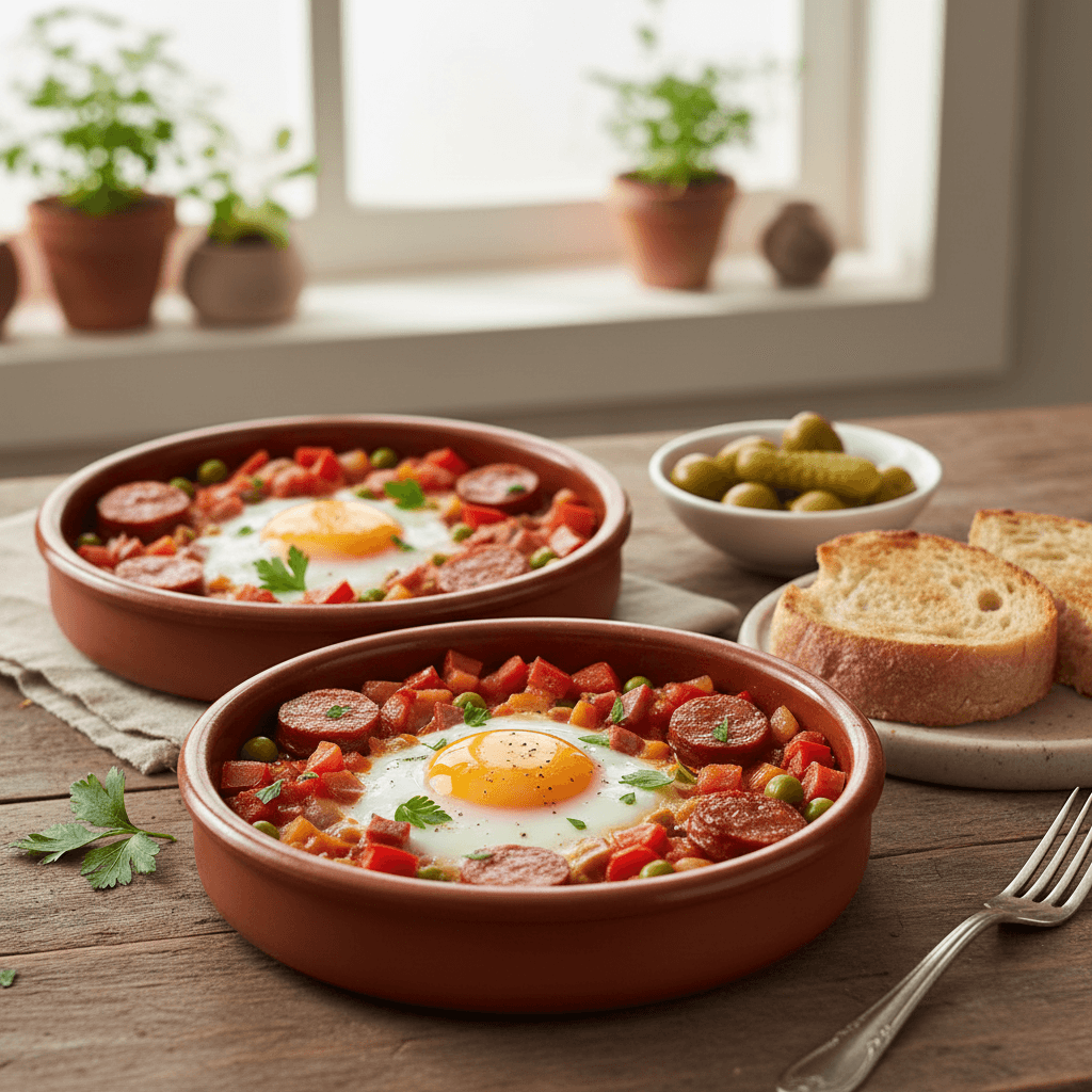 Plato andaluz tradicional. Huevos horneados sobre sofrito de verduras con jamón y chorizo. Se hace en cazuelitas individuales de barro, muy visual y sabroso.