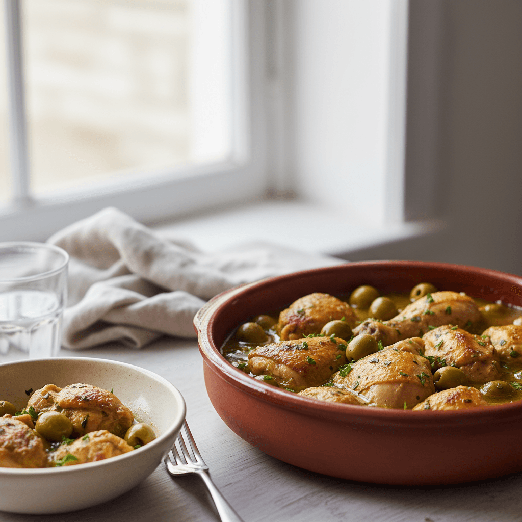Pollo en cacerola con aceitunas verdes